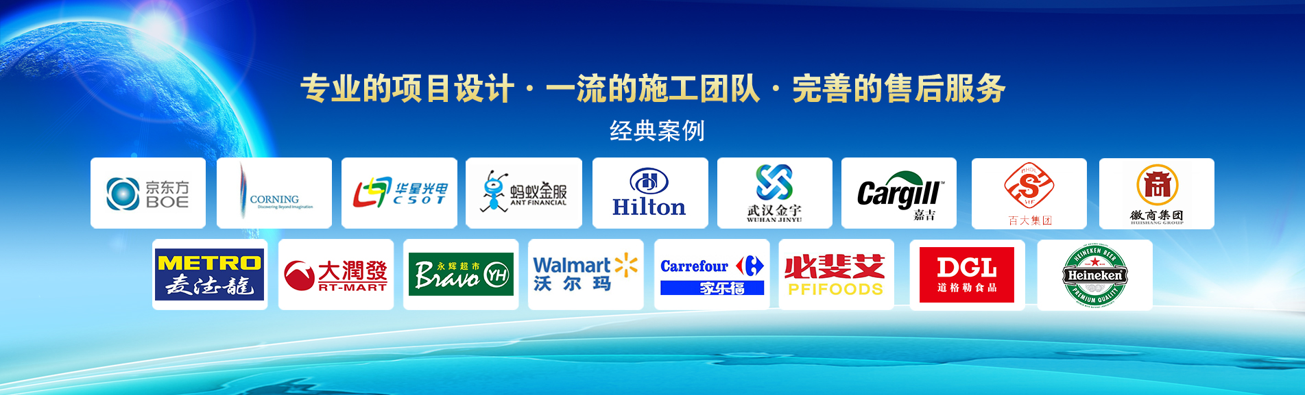 冷凍冷藏設(shè)備大型冷庫(kù)項(xiàng)目: 武漢中百物流冷庫(kù)(40000㎡)、蘇州、北京普洛斯大型物流庫(kù)(17000㎡)、沈陽(yáng)佳德物流冷庫(kù)(20000㎡)、上海東航配餐物流庫(kù)(6000㎡)、杭州華商勾莊物流冷庫(kù)(24000㎡)、安徽安心蔬菜綠色食品冷庫(kù)(12000㎡)、武漢金宇冷庫(kù)(35000㎡)、必斐艾食品廠(14000㎡)、中國(guó)-東盟(百色)農(nóng)產(chǎn)品交易中心冷庫(kù)物流工程(30000㎡)、遵鐵物流冷鏈物流區(qū)建設(shè)項(xiàng)目中心冷庫(kù)物流工程(16500㎡)、長(zhǎng)沙云冷產(chǎn)業(yè)園冷庫(kù)物流工程(21000㎡)等;大型中央空調(diào)項(xiàng)目: 武漢康寧顯示玻璃廠廠房、武漢京東方模組廠房、武漢華星光電模組廠房、深圳華星光電模組廠房,杭州阿里巴巴辦公樓,舟山波音737機(jī)場(chǎng)辦公樓,南京江北能源站、上海金融大酒店等